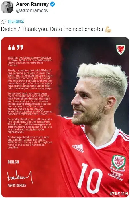 官方:阿森纳传奇拉姆塞宣布退役。
