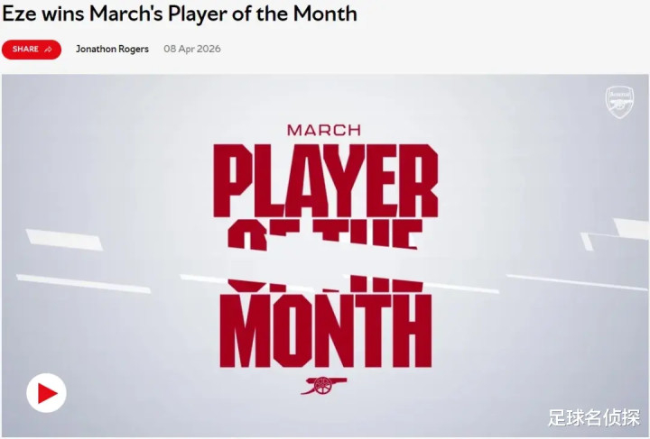 官方:阿森纳宣布埃泽被评为了队内3月份最佳球员,英格兰人得到了球迷37%的投票,拉亚和赖斯分列二三位。