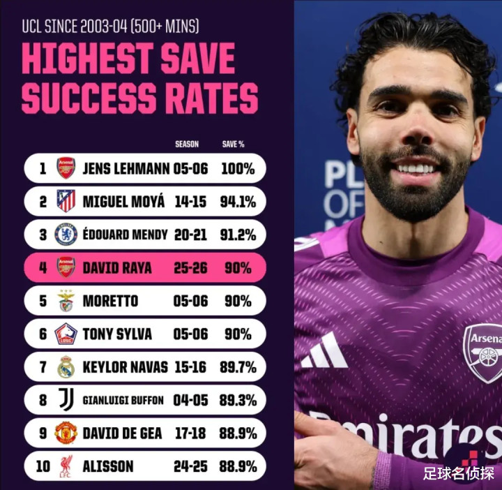 Opta统计,自2003-04赛季以来,出战500分钟以上的门将中,欧冠单赛季扑救成功率排名里,本赛季拉亚以90%的扑救成功率排在第四位。