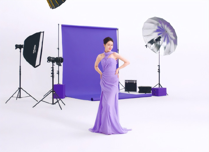 裙装采取淡紫色的主色调,不仅高贵典雅,还带有一丝神秘和浪漫。而缎面材质特有的光泽感,又使裙装在灯光下更加闪亮和动人,增加了整体的奢华度。