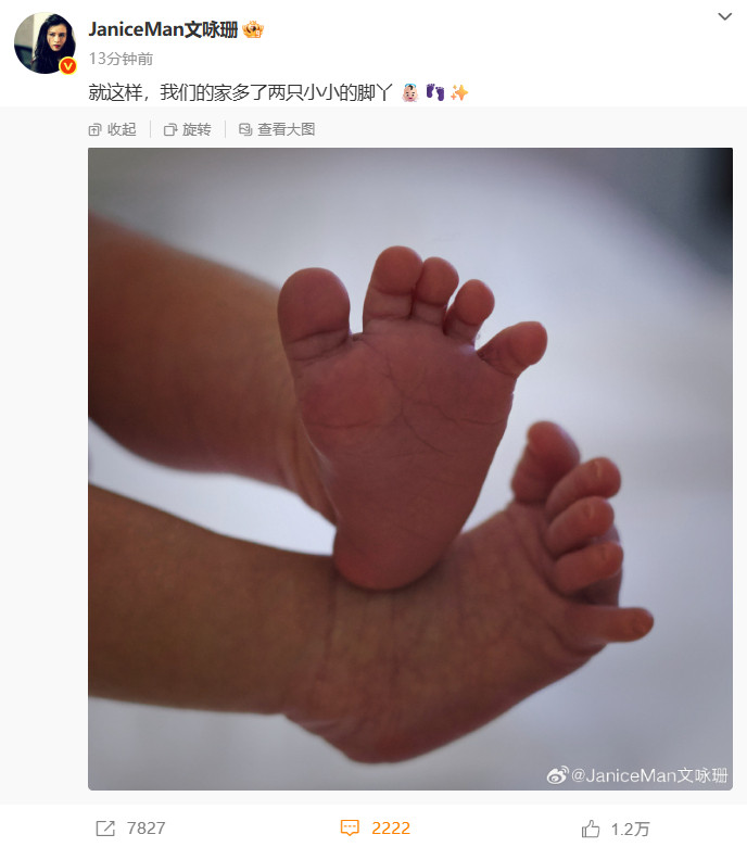 9月30日,女星文咏珊发博:“就这样,我们的家多了两只小小的脚丫。”,并晒出小宝宝的脚丫照,官宣当妈。