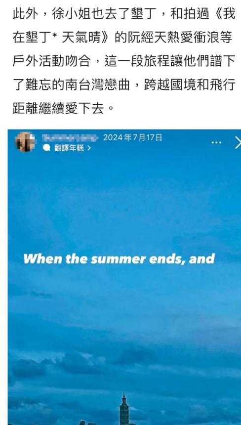 细细查找徐小姐的社群,也不难发现她和阮经天的连结与爱的痕迹,比如说在一则她到访台北的贴文中,就见她除了拍摄敦化北路绿意一片的林荫,还有隔壁大楼的铁架阳台、背景是松山机场停车场,以及华信航空的库房,画面也不难想象那是阮经天新购入破亿元豪宅的窗外视角。