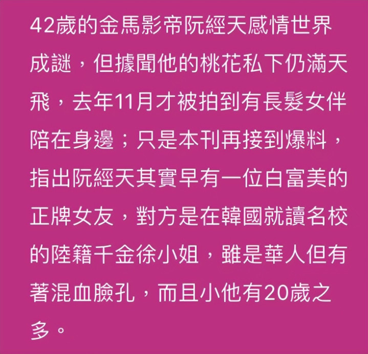 据悉,阮经天的小女友姓徐,她是来自大陆的富家千金,目前则在韩国攻读。台媒指,徐小姐曾来台和阮经天共度好几周,就住在阮经天的北市敦北豪宅。