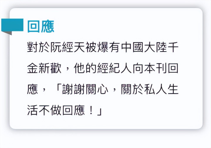 对于阮经天被爆有中国大陆千金新欢,他的经纪人向本刊回应,“谢谢关心,关于私人生活不做回应!”