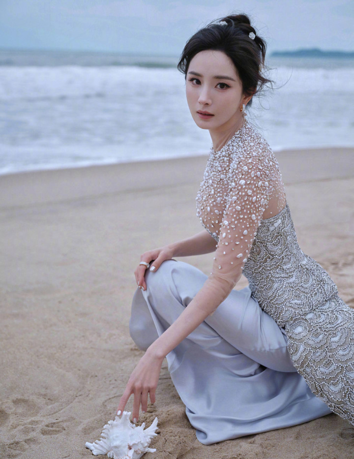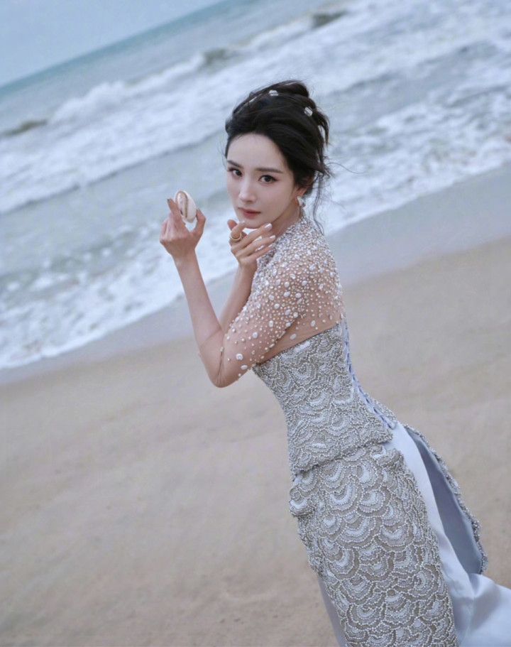 ELLE80 周年风尚大典三亚红毯刚启幕,杨幂的出场就让所有镜头失了焦,一身珍珠贝壳鱼尾礼裙裹着丰满曲线,海风一吹美成全场焦点。