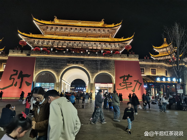 半途挡不住街对面熙熙攘攘人群的吸引,好奇心趋势,又让一家人拐到了红河水乡湿地公园看看。红墙黑砖的城楼前,音乐声响很大,不少人在这起舞。走过城楼,进入繁华的商业区,夜色里这里看似江南水乡,小桥流水,灯红酒绿,这里的商业化氛围很浓烈,人气也旺,粗粗看了几眼就返回了,住在附近,还会有机会过来细细看,慢慢品。