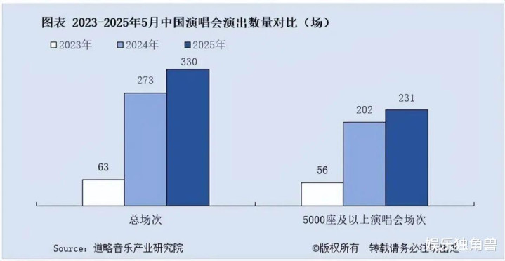 据道略音乐产业研究院数据,2025年,国内5月总演出场次达330场,同比增长20.9%;5月全国演唱会观众达448.4万人次,与2024年4月(364.0万人次)相比,同比增长23.2%;5月票房总收入达33.33亿元,较2024年同期有小幅增长。全国音乐节举办数量、观众人次、演出票房,与去年相比同样有四成左右的增幅。据此可以推断密集开演的6月,数据大概率相比5月只高不低。