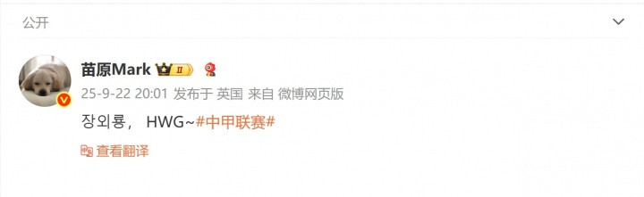 直播吧09月22日讯 媒体人苗原今日在社媒写道:장외룡, HWG~,并带上了中甲联赛标签。