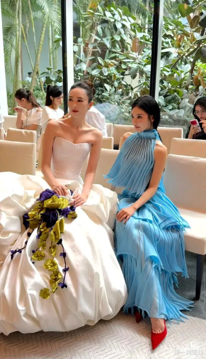 张婧仪则身穿香槟粉金色渐变鱼尾长裙,搭配Cartier高级珠宝,呈现“深海人鱼公主”主题。蓬松盘发与碎发设计增添慵懒浪漫感,被媒体形容为“油画少女”和“海妖塞壬降临”。