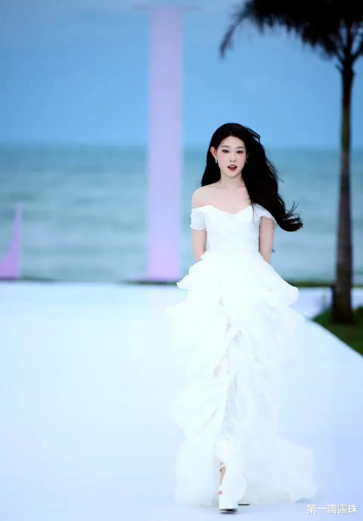 这是她头一回站上这么大的主流时尚盛典,穿了条蓬蓬松松的白色纱裙,妆容清清爽爽,活像从海里飘上来的小仙子。