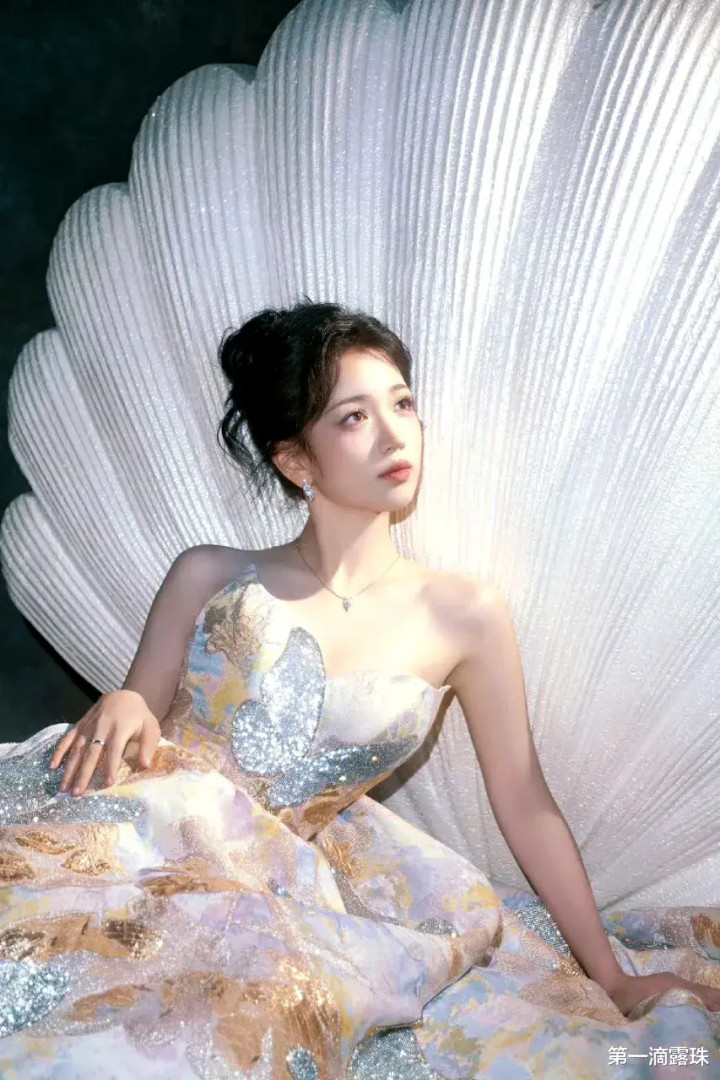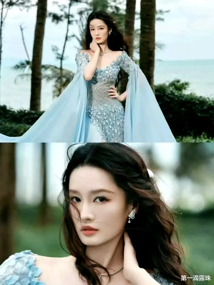 李沁这次的造型算是精准踩中了“海洋主题”的精髓,一身浅蓝色鱼尾长裙把她纤细的身段勾勒得明明白白,裙身缀满细碎的水晶,海风一吹就闪着粼粼波光,活脱脱一位“白月光人鱼”。