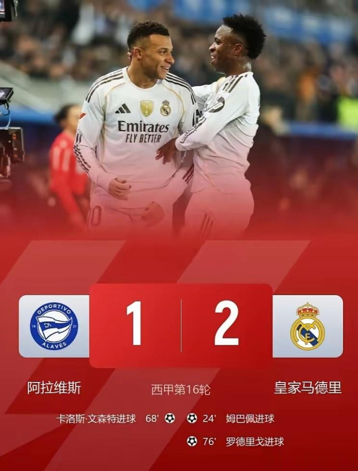 第77分钟,再次领先!维尼修斯左路传中送助攻,罗德里戈中路推射破门!皇马2-1阿拉维斯!