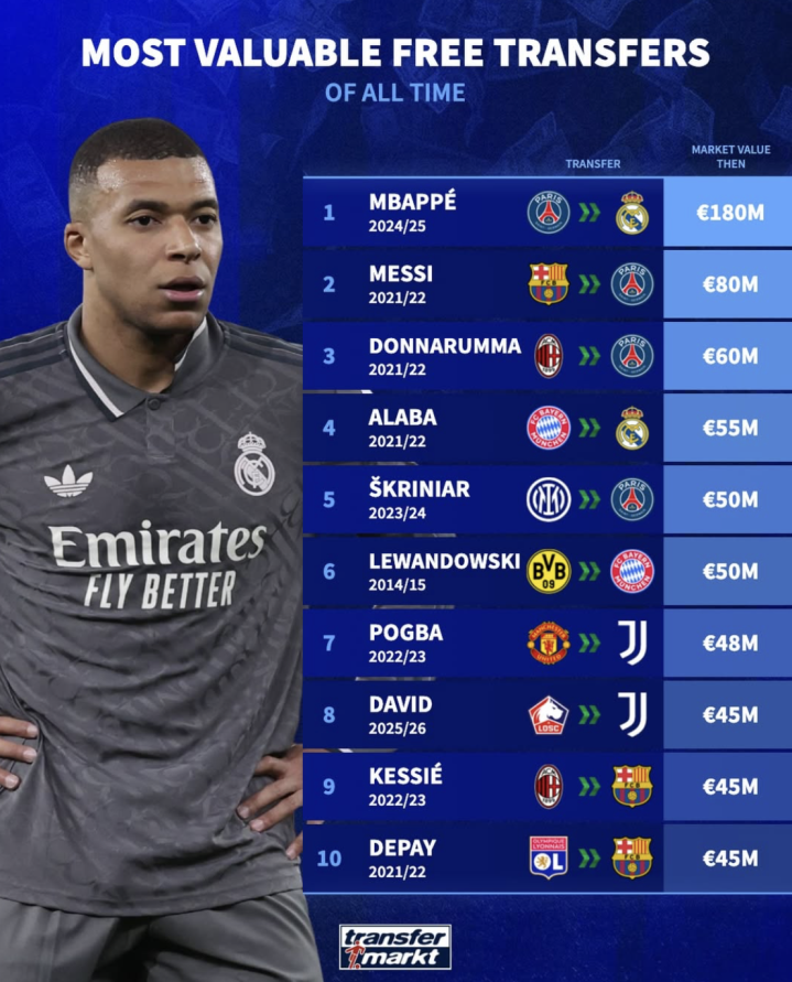 姆巴佩以当年1.8亿欧的身价高居榜首,梅西和多纳鲁马分别以8000万和6000万排名二三位。